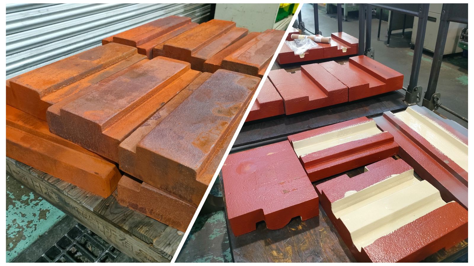 鋳物は応力除去する為にしばらく雨ざらしにするので、塗装されてくる物はいいのですが、錆びていて触ると汚れます。さらに切削すると切粉はボロボロで細かく、機械も加工者もすぐに真っ黒になるのでその後の処理が大変です。